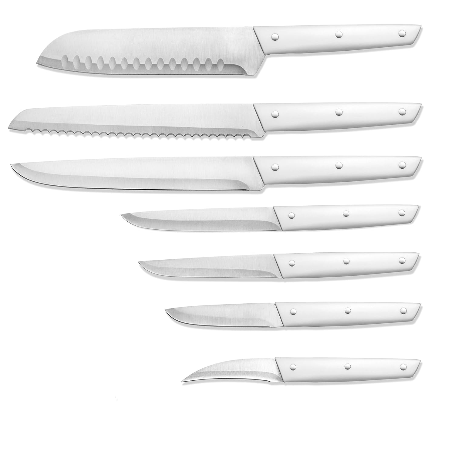 - Set includes: knife block, 8-inch chef, 8-inch bread, 8-inch slicing, 5-inch utility, 3.5-inch parer, 3-inch birds beak and six 4.5-inch steak knives